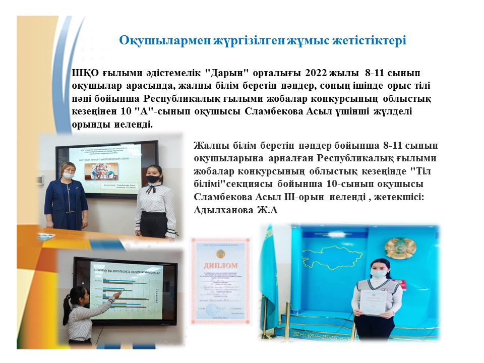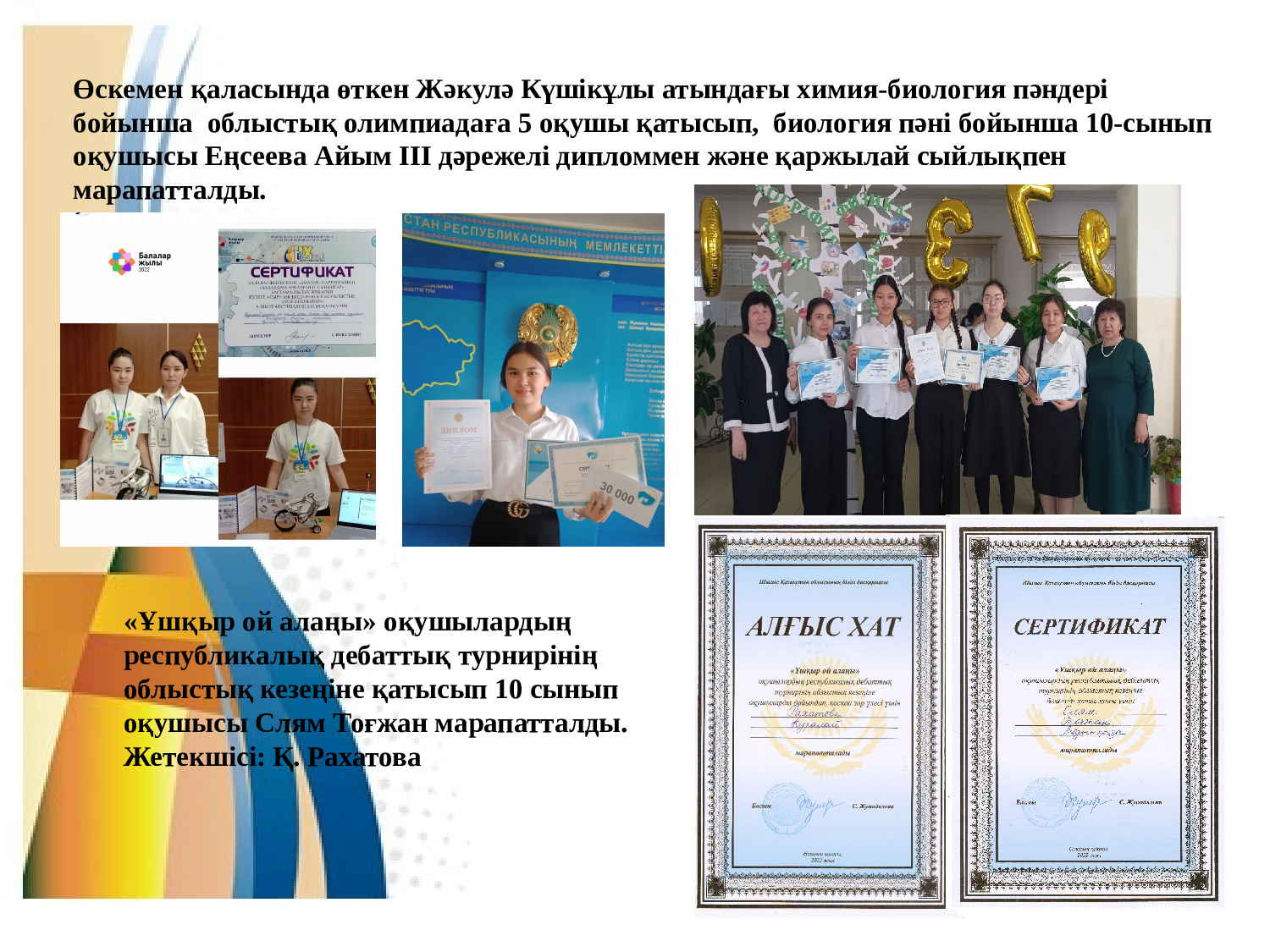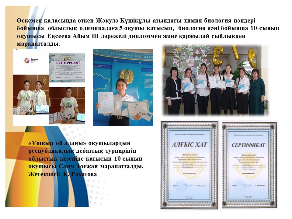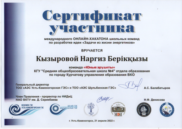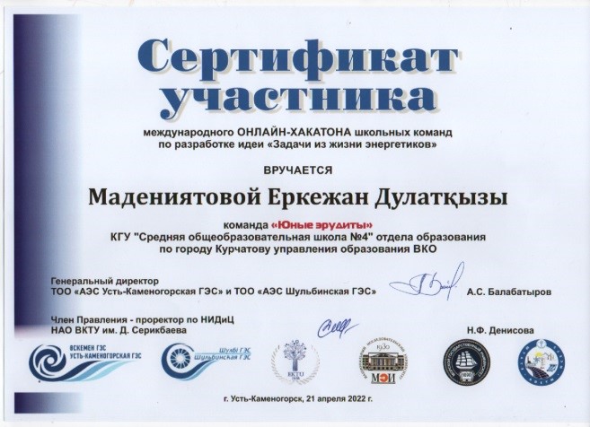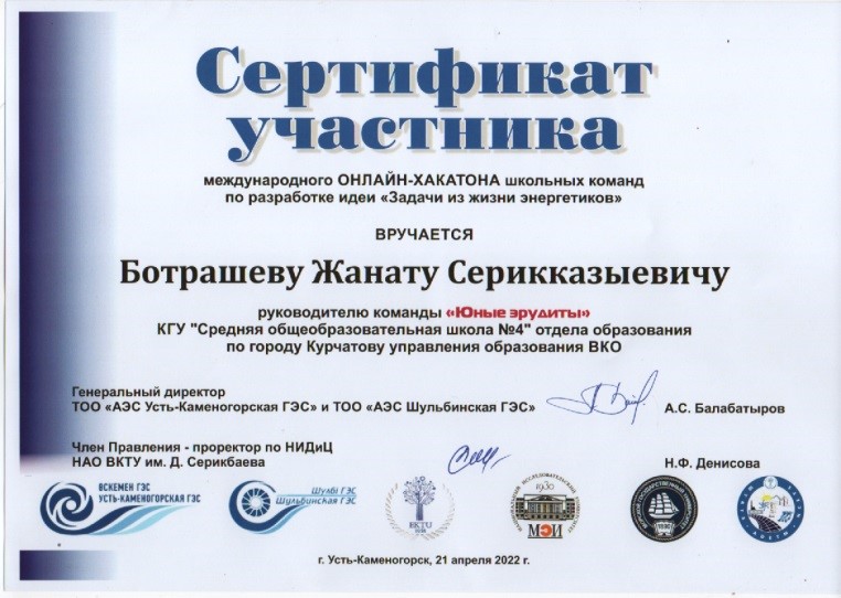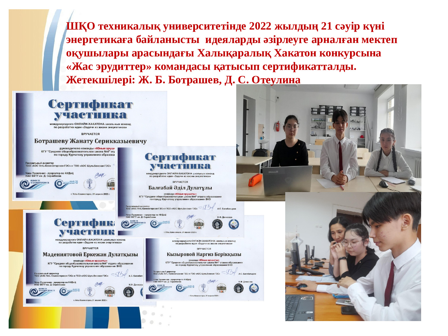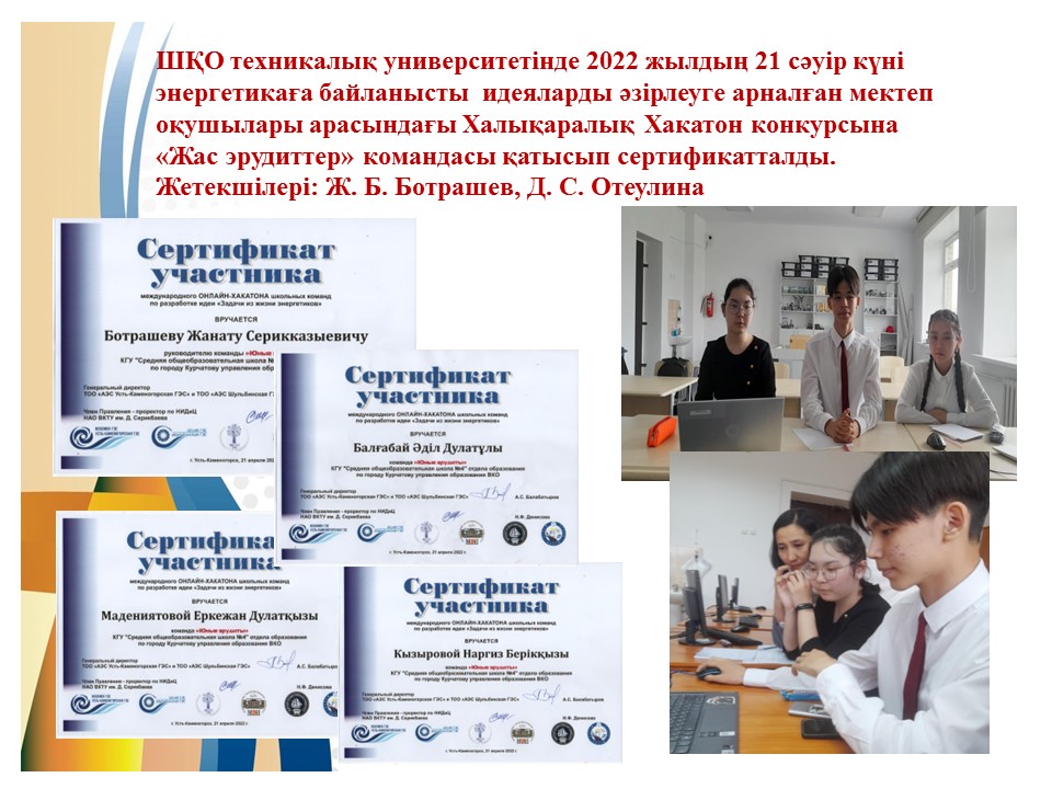ШҚО техникалық университетінде 2022 жылдың 21 сәуір күні энергетикаға байланысты идеяларды әзірлеуге арналған мектеп оқушылары арасындағы Халықаралық Хакатон конкурсына «Жас эрудиттер» командасы қатысып сертификатталды. Жетекшілері: Ж. Б. Ботрашев, Д. С. Отеулина