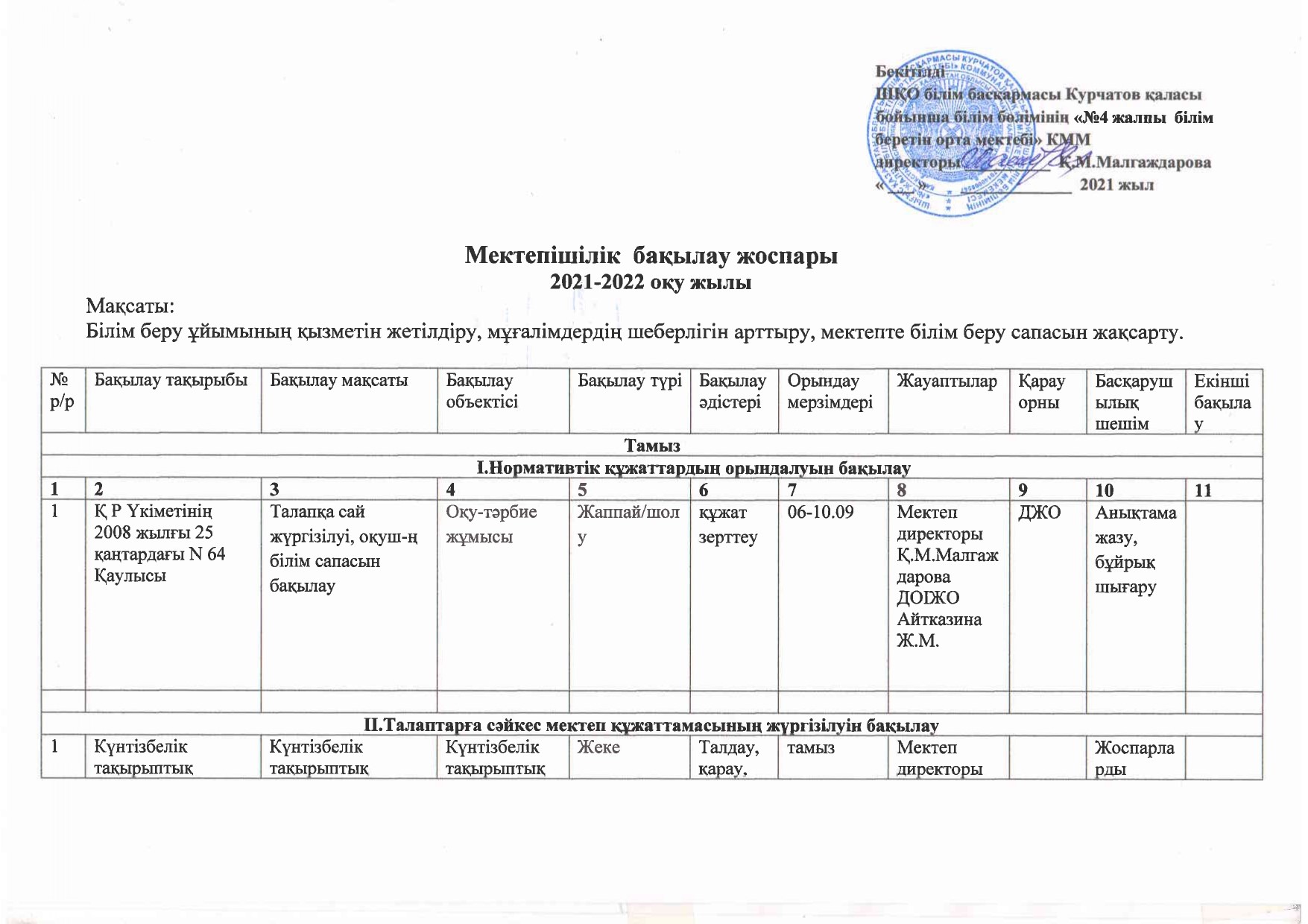 | 1 | Мектепішілік бақылау жоспары |