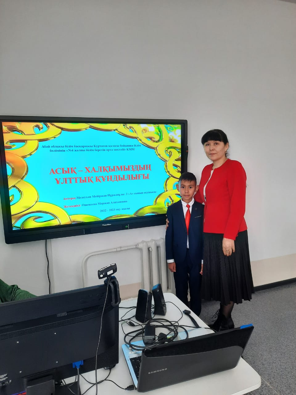 Медеухан Мейіржан 1 орын, Урманбек Әмина 2 орын иеленіп, екі оқушымыз да облысқа жолдама алды. Жетекшілері: Ошеекева Маржан Алиханова бастауыш сынып мұғалімі, Адылханова Жанар Акановна орыс тілі мен әдебиеті мұғалімі.